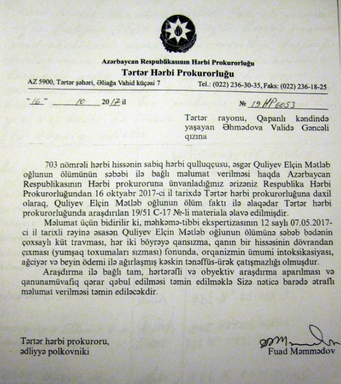 Əhmədova deyir ki, oğlunun ölüm haqda sənədi ona aylar sonra təqdim edilib. Ölüm haqda və məhkəmə-tibbi ekspertizanın təqdim etdiyi sənədlərdə Elçin Quliyevin ölümünə səbəb kimi bədənin çoxsaylı küt travması, hər iki böyrəyə qansızma, qanın bir hissəsinin dövrandan çıxması (yumşaq toxumaları sızması) fonunda orqanizmin ümumi intoksikasiyası, ağciyər və beyin ödemi ilə ağırlaşmış kəskin tənəffüs-ürək çatışmazlığı olduğu göstərilir.