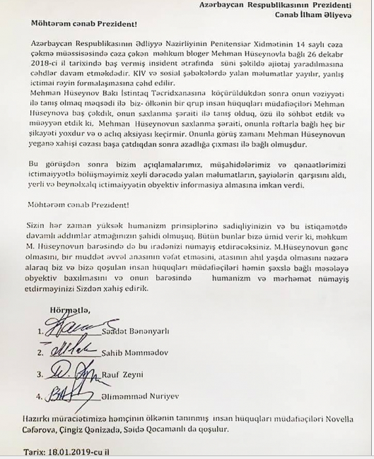 "Möhtərəm cənab prezident, sizin hər zaman yüksək humanizm prinsiplərinə sadiqliyiniz və bu istiqamətdə davamlı addımlar atmağınızın şahidi olmuşuq. Bütün bunlar bizə ümid verir ki, məhkum M. Hüseynovu barəsində də bu iradənizi nümayiş etdirəcəksiniz. M.Hüseynovun gənc olmasını, bir müddət əvvəl anasının vəfat etməsini, atasının ahıl yaşda olmasını nəzərə alaraq biz və bizə qoşulan insan hüquqları müdafiəçiləri həmin şəxslə bağlı məsələyə obyektiv baxılması və onun barəsində humanizm və mərhəmət nümayiş etdirməyinizi Sizdən xahiş edirik".