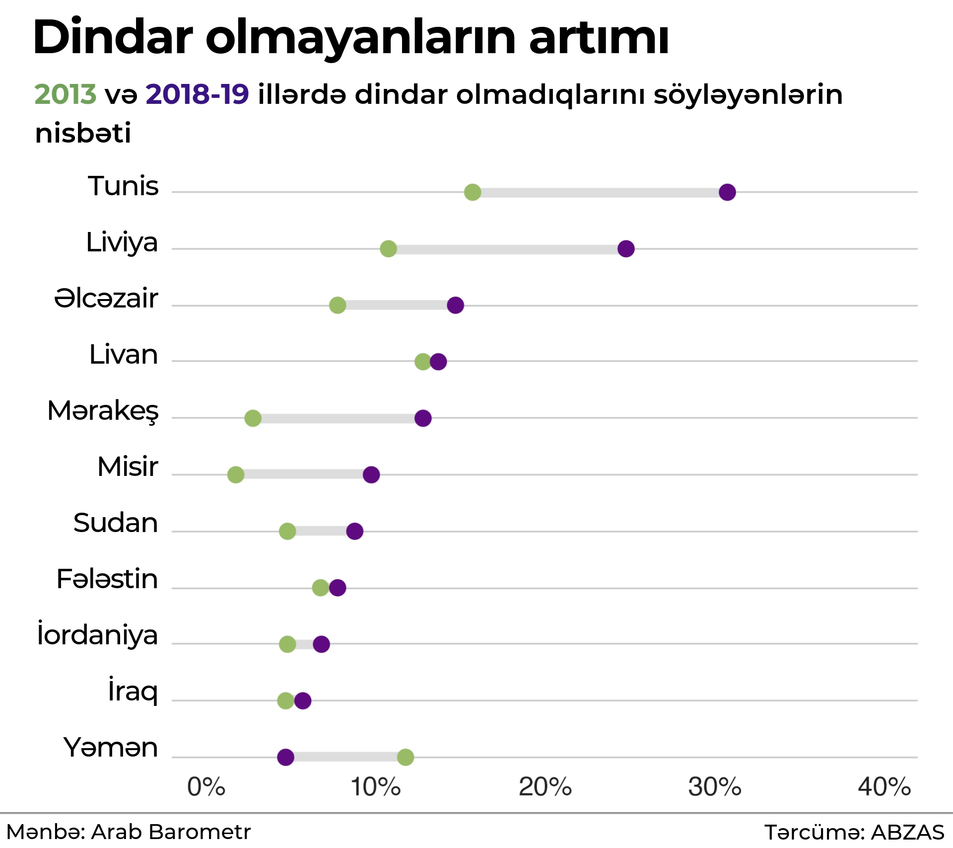 2013-cü ildən etibarən, regionda "dindar olmayan" insanların sayı 8%-dən 13%-ə qalxıb. Araşdırmaya görə, artım ən çox 30 yaşadək olanlar arasındadır, onların arasında 18%-i dindar olmadığını bildirib. Yalnız Yəməndə bu kateqoriya üzrə azalma görünür.