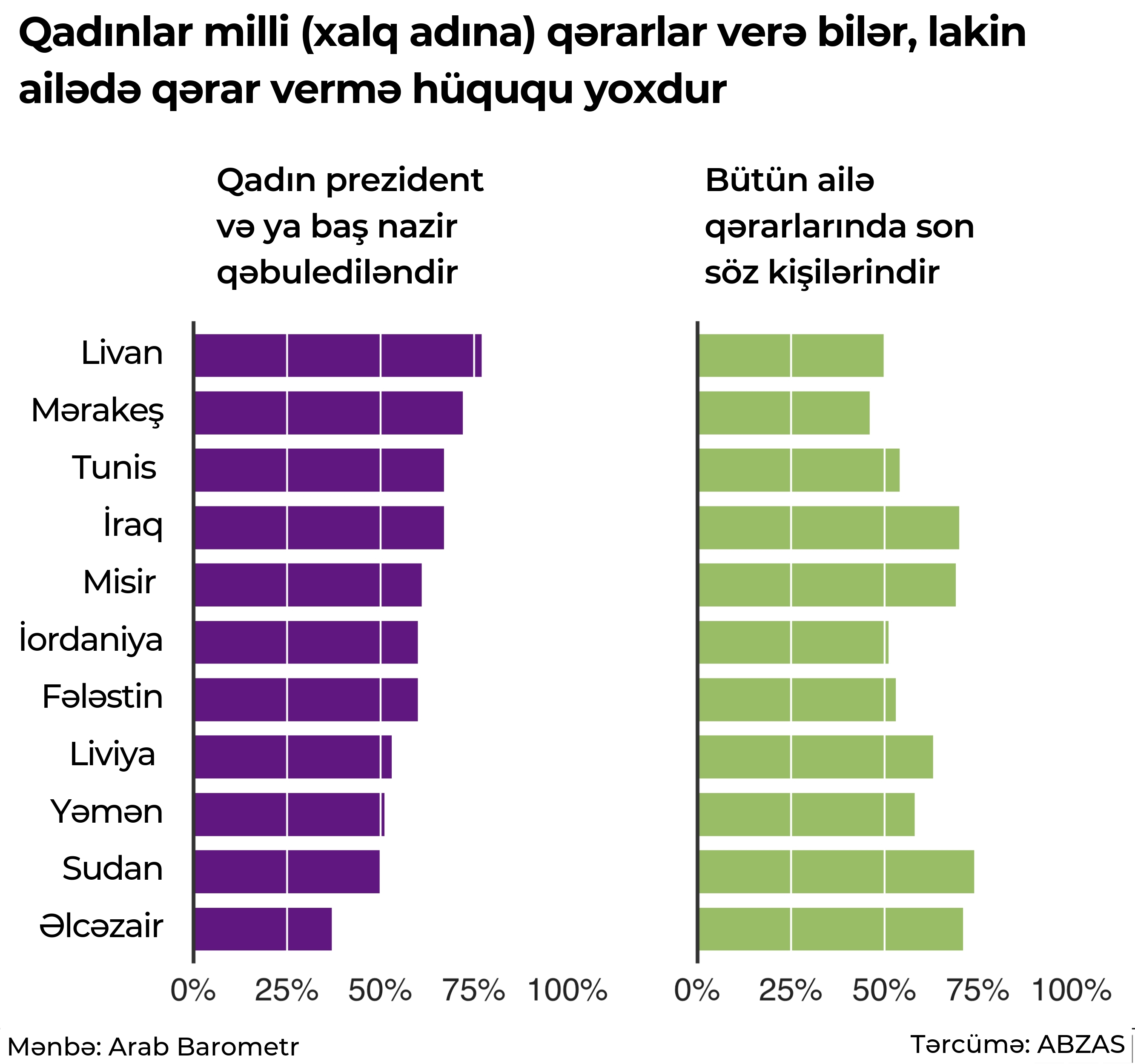 Regionun əksəriyyəti qadınların baş nazir və ya prezident olmaq hüququnu dəstəkləyib. Yalnız Əlcəzair istisna olmaqla, burada sorğuda iştirak edənlərin 50% -dən azı qadın dövlət başçısını məqbul hesab edib.