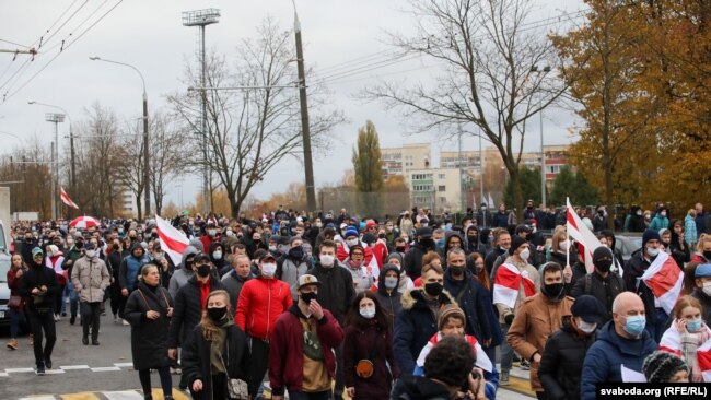 Minlərlə nümayişçi demək olar ki, gündəlik keçirilən etiraz aksiyaları və Aleksandr Lukaşenkonun istefası və yeni səsvermə tələblərinin bir hissəsi olaraq noyabrın 1-də Minskdə paralel yürüşlərdə iştirak edib.