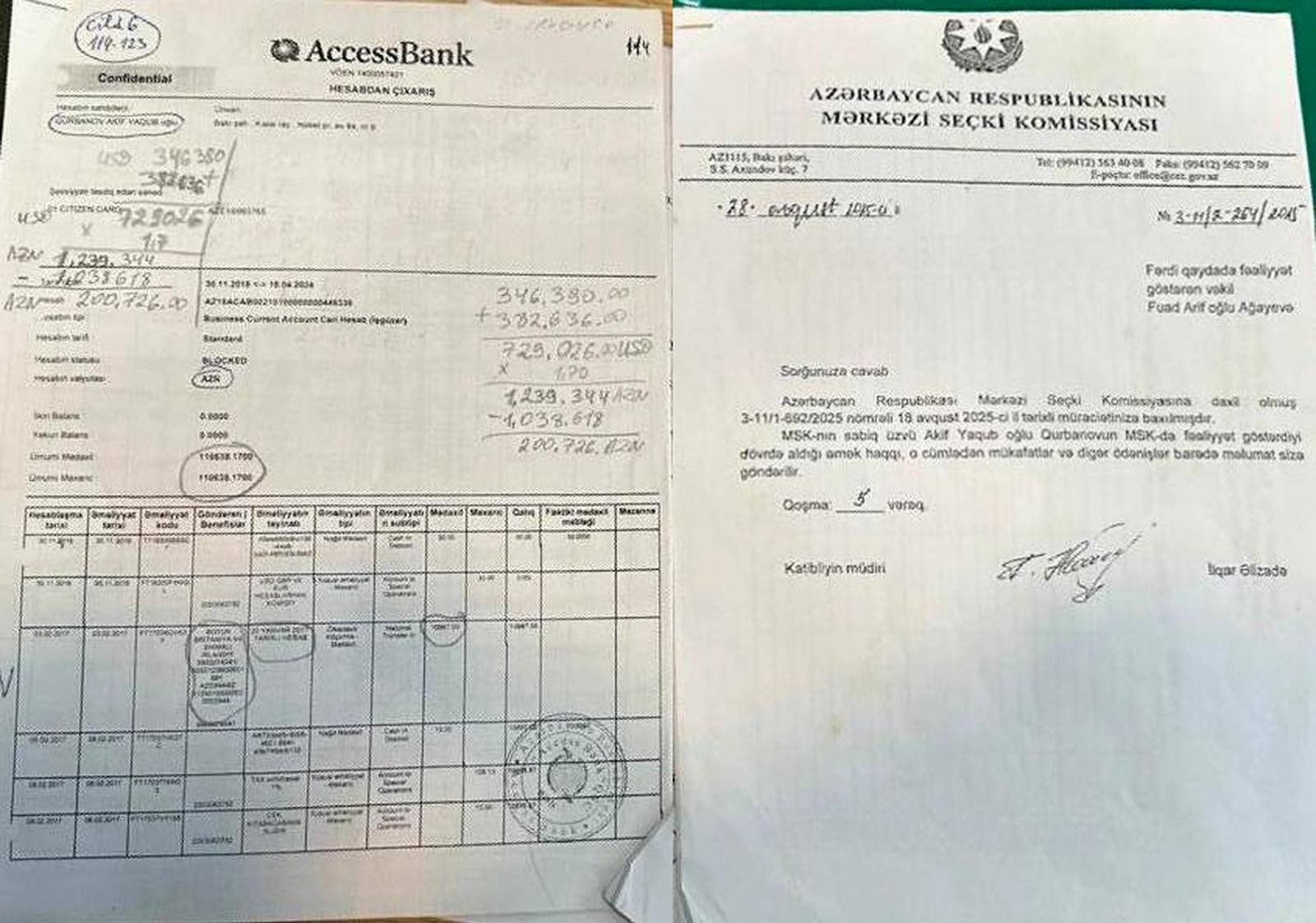 Akif Qurbanovun adından “Facebook”da paylaşılan müraciətdə o, gəlirlərini təsdiqlədiyini bildirdiyi üç sənədi ictimaiyyətə açıqlayıb və həmin sənədləri məhkəməyə də təqdim edəcəyini yazıb.