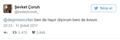 Kanal D-də yayımlanan "Arka Sokaklar" adlı serialda rol alan Şevket Çoruh, İrfan Değirmencinin işinə son verilməsinə reaksiya verərək, "Twitter" hesabından "Mən də "yox" deyirəm, məni də qovun" açıqlamasını edib.