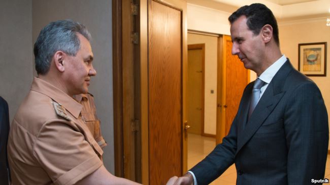 Suriya, Bashar al-Assad (sağ) Rusiyanın müdafiə naziri Sergei Shoigu Dəməşq, 18 iyun 2016[/caption]