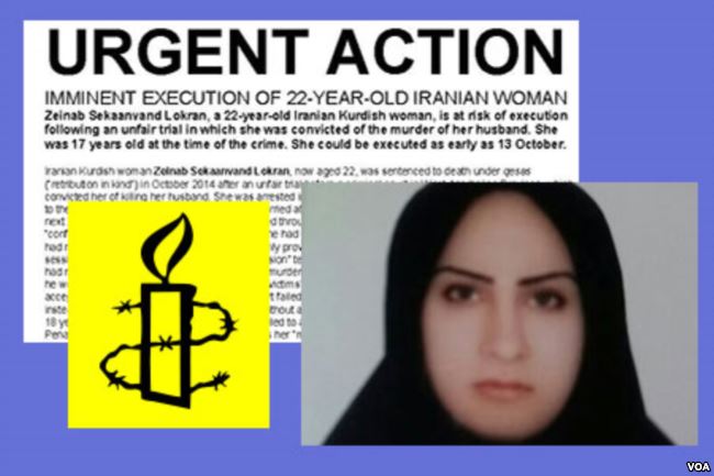 Amnesty International İran Azərbaycanının kürd icmasına mənsub Zeynəb Sekanvəndin ölüm cəzasının icrasından sonra “ailə zorakılığı və cinsi istismar qurbanı, uşaq yaşlarında həbs edilmiş qadının edamı” başlıqlı bəyanat yayımlayıb.
