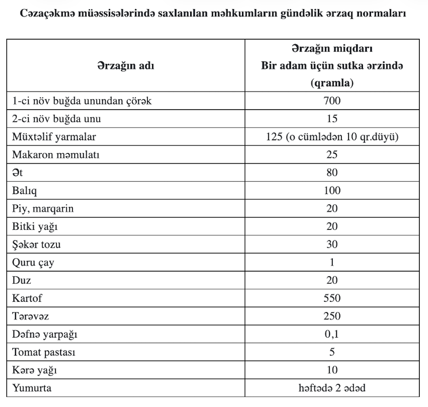 Məhkumların yemək və maddi məişət normaları Nazirlər Kabinetinin (NK) 154 nömrəli qərarı ilə təsdiqlənib. Həmin qərarda cəzaçəkmə müəssisələrində saxlanılan məhkumlar üçün ərzaq normaları müəyyənləşdirilib.